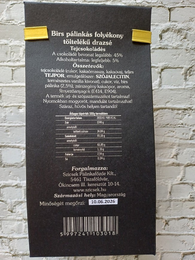 Összetevők: Tejcsokoládé (cukor, kakaómassza, kakaóvaj, teljes tejpor, emulgeálószer: szójalecitin, természetes vanília kivonat), cukor, víz, birs pálinka (2,5%), zsírszegény kakaópor, aroma, fényesítőanyagok (E414, E904).