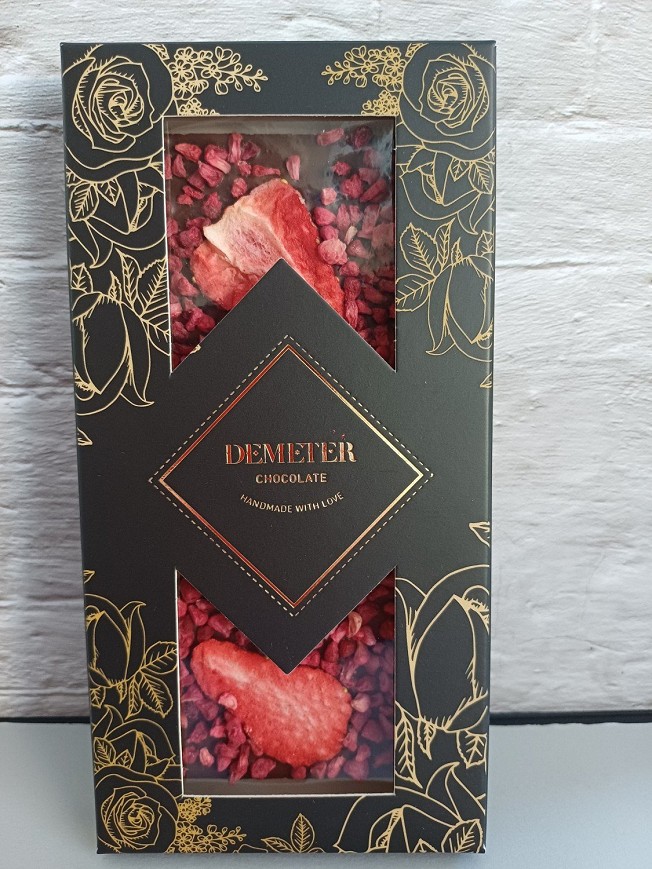 Összetevők: kakaómassza, édesítőszer: maltitol, kakaóvaj, emulgeálószer: szójalecitin, liofilizált málna és eper, természetes vanília Kakaó szárazanyag tartalom: 60%
