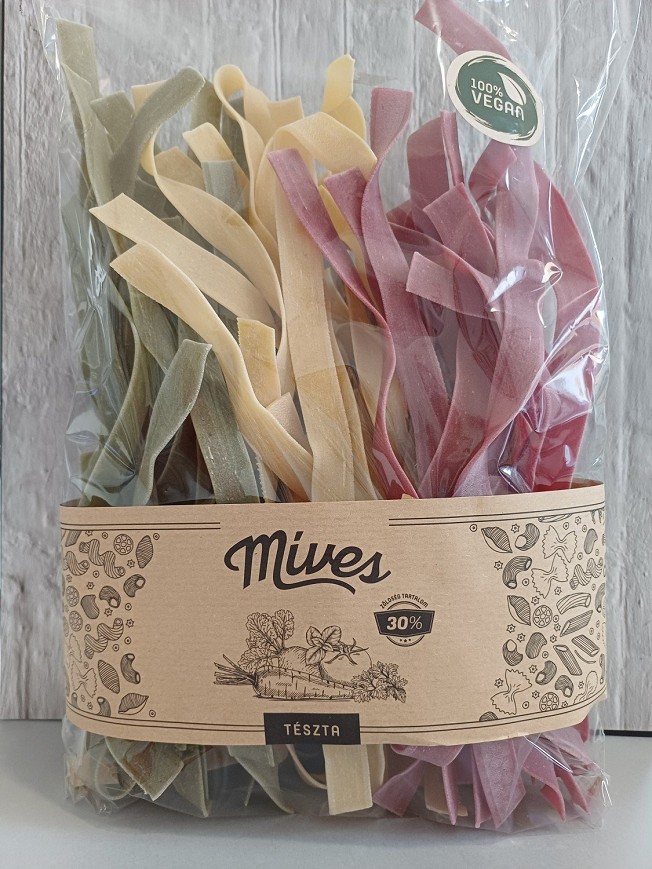 Összetevők: durum liszt, 30% zöldséget püré (paradicsom, cékla, sárgarépa, spenót változó arányban), só.